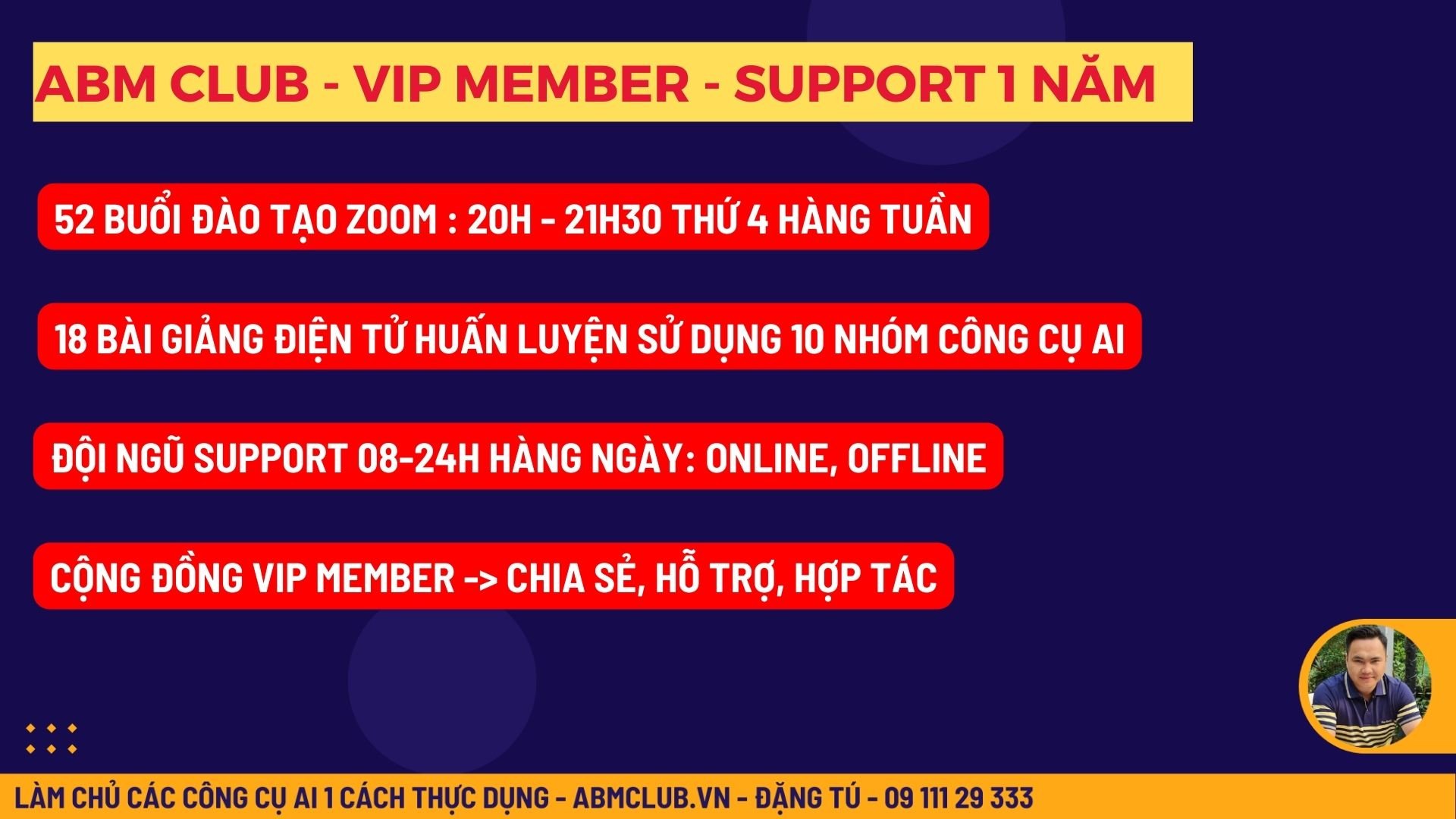 Chương trình VIP Member của ABM không chỉ cung cấp quyền truy cập vào loạt 18 bài giảng điện tử toàn diện từ cơ bản đến nâng cao, mà còn mở ra cánh cửa tham gia 52 buổi đào tạo qua Zoom hàng tuần. Những buổi đào tạo này, diễn ra vào 20h Thứ Tư mỗi tuần, sẽ cập nhật những thông tin mới nhất và chia sẻ kinh nghiệm thực tế, giúp bạn không chỉ học hỏi mà còn áp dụng AI một cách hiệu quả.